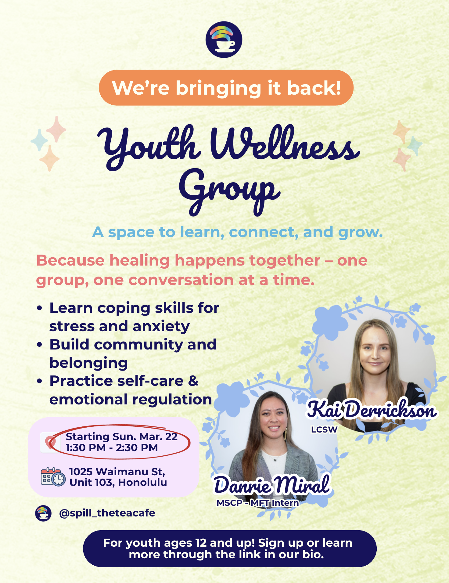 - Learn coping skills for stress & anxiety- Build confidence, belonging, and community
