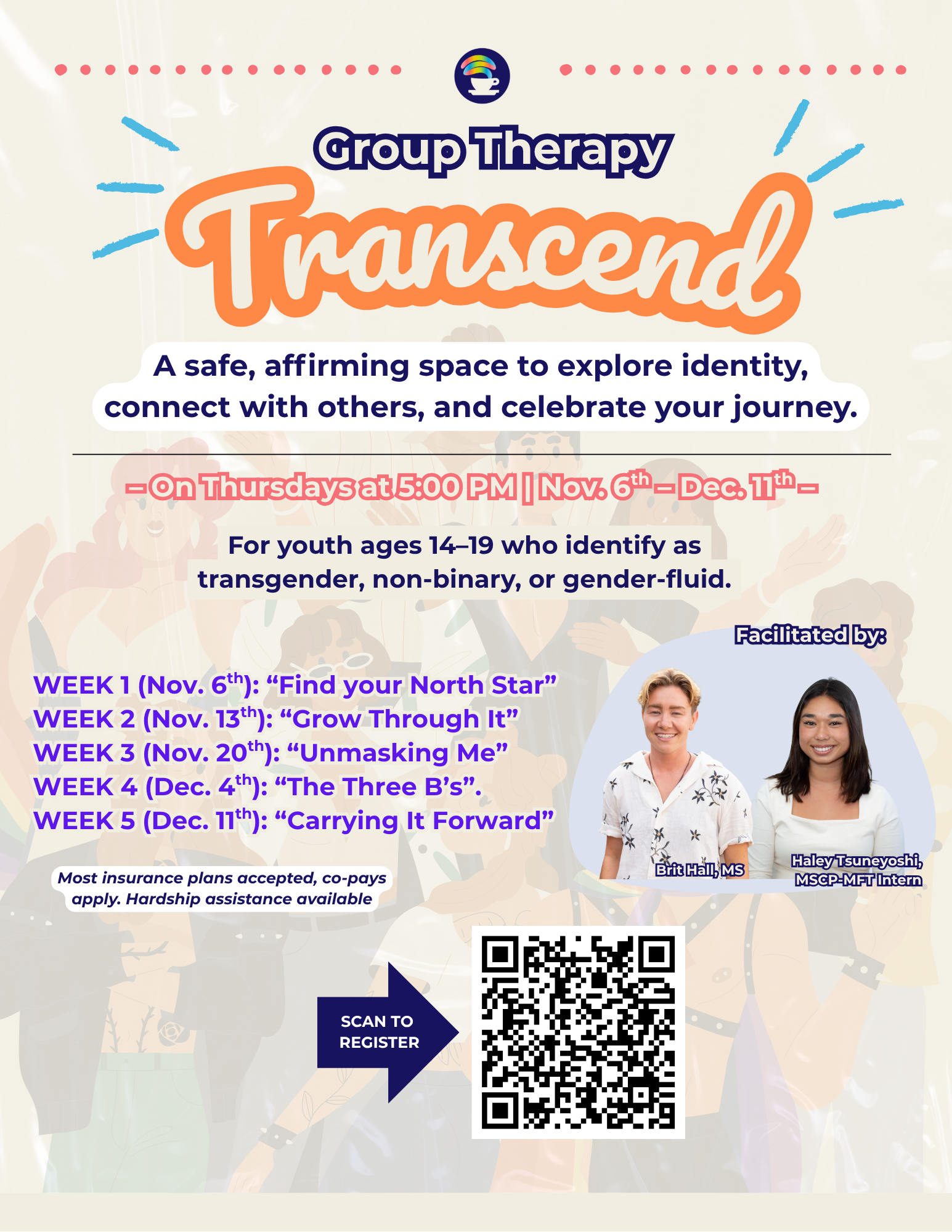 A 5-week safe, affirming space for youth ages 14–19 who identify as transgender, non-binary, or gender-fluid.